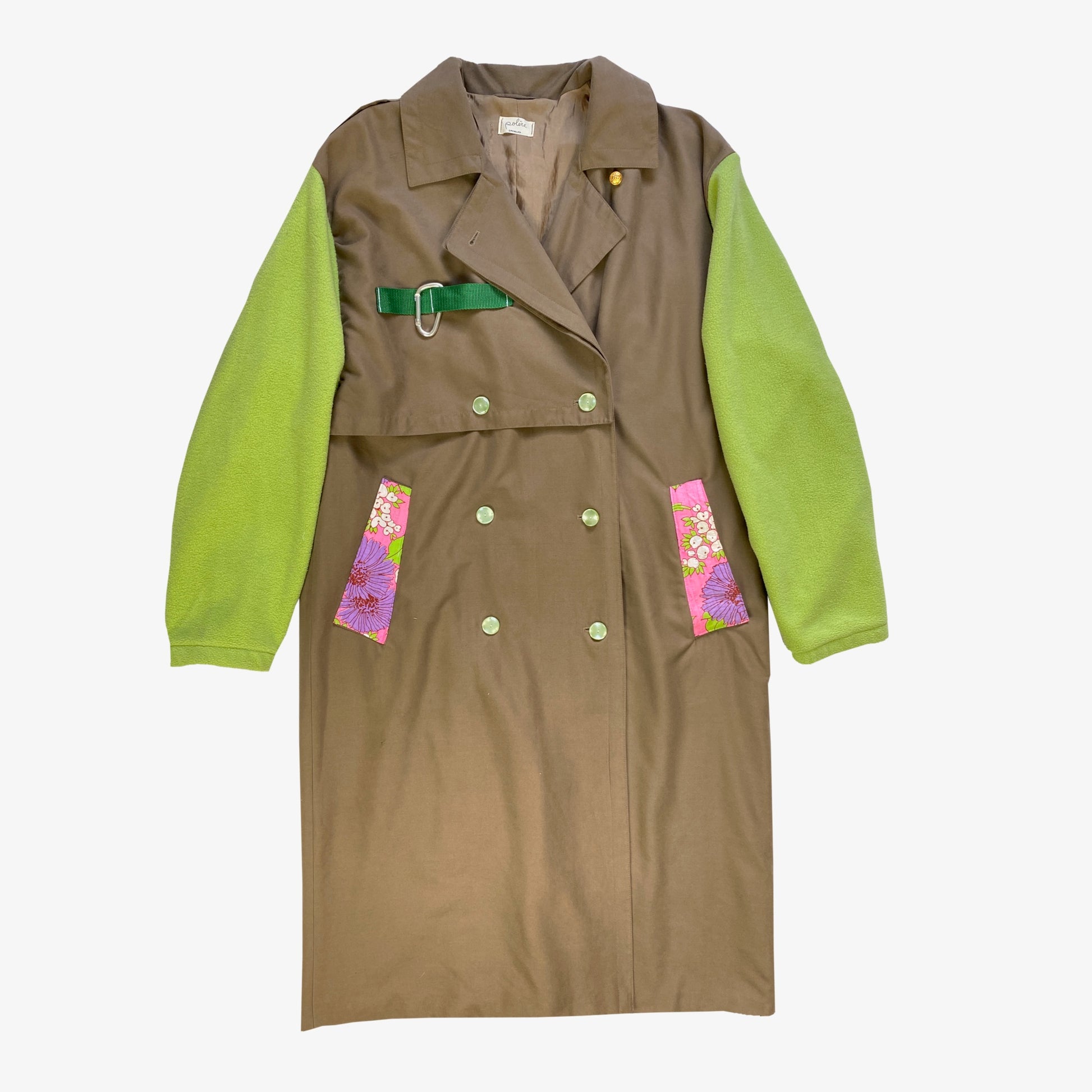 Ce trench est une pièce unique réalisée à partir de matériaux recyclés. Deux poches sur le devant avec une petite bande pour un stylo, clés...